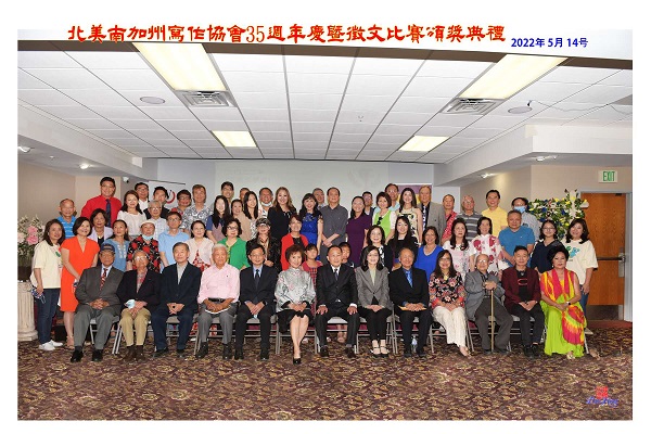 「北美南加州華人寫作協會」全體首先恭賀北美華文作家協會前總會長吳宗錦功成身退、新總會長游篷丹隆重接任,北美華文作家協會會務欣欣向榮。 2022年,「北美南加州華人寫作協會」為慶祝創會35周年並鼓勵華文創作,特別舉辦《第一屆北美洲文苑文學獎徵文比賽》,成果可說相當豐碩,在此先感謝北美華文作家協會總會及各分會會長們的鼎力支持。這次徵文比賽收到的作品來自美國二十餘州、加拿大、台灣、中國大陸、澳洲等地,參與的華人幾乎涵蓋了大半個地球,可以想見喜歡寫作的華人朋友遍布各地,而他們又是多麼的期待及重視寫作的機會。擔任評審的著名作家吳鈞堯表示參賽作品水準相當好,參加徵文人士對「南加作協」舉辦這項徵文比賽,也紛紛表示感謝,使我們深覺鼓勵海外華人中文寫作,極負使命感。 在2022年5月14日頒獎典禮上,華府作協王志榮會長、紐約作協李秀臻會長、北美洲華文作家協會副會長暨海外女作家協會張鳳會長、 北美洲華文作家協會副會長陳玉琳、北德作協林良姿會長、及最遠的南美作協林美君會長也都在線上致詞感想發表,讓我們深感榮幸。 除此之外,從2022年到2023年,「南加作協」並舉辦了不同的講座,包括:
