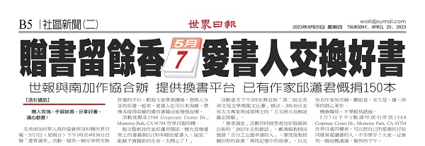 2023年「南加作協」慶祝創會36周年,不但為《2023年文苑》舉行新書發表會,並為鼓勵大眾分享好書,5月 7日特別與世界日報合辦「書香滿堂」贈送書籍活動, 當天也同時宣布《第二屆北美洲文苑文學獎徵文比賽》辦法,有了第一屆的 經驗,我們相信第二屆的成果將更豐碩。