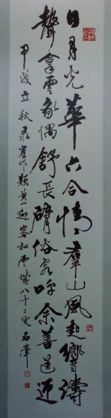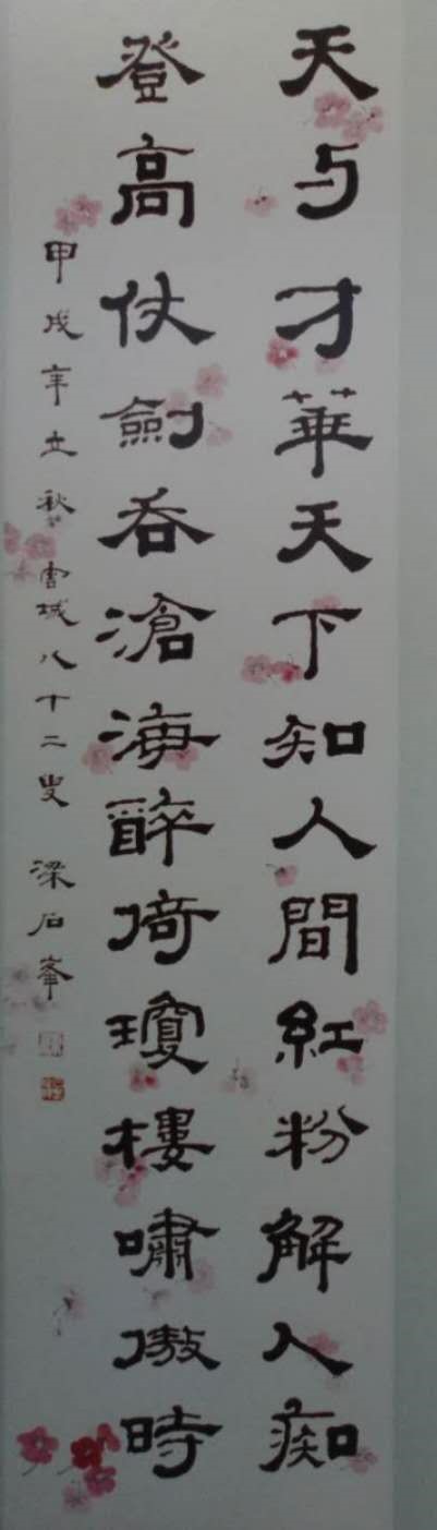 2001年夏,溫哥華中華文化中心在中華門牌坊下,舉辦了“華埠文化藝術市場”活動。筆者榮幸與溫哥華藝術界三老(陳風子、梁石峰、周士心)之一的梁石峰老師,及劉國藩先生一起,應中心主席簡穎湘女士邀請,擔任征聯比賽評判,幷分別出上聯。從此,我正式認識了這位詩書畫大家梁石峰老師。