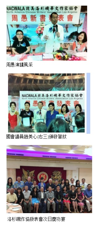 洛杉磯作家協會前會長周愚的第十九部作品《地中海上的探戈》,由台北采薇出版社出版發行,該書之發表會於7月30日成功舉辦。發表會由作協現任會長彭南林及北美河濱分會會長劉於蓉任總策畫,聞淑貞任主持人,洛杉磯作協創會會長蓬丹任評介人,四位附篇作者段金平、林良姿、吳慧妮、荻野目櫻分別發表感言,作協前會長陳十美作結論,顧問游芳憫作總評。 聞淑貞致開場詞時說,她很榮幸能擔任發表會的主持人。她說她的公公汪夢泉將軍也是飛行員,並是周愚的飛行教官,因此周愚一直以師妹來稱呼她,她能為師兄服務,合作愉快,感到萬分高興。 彭會長致詞感謝所有到場的來賓,並介紹周前會長從飛官到大作家,勤於筆耕,服務僑界,這部新書由38篇散文組成,分為「甜酸苦辣」、「紙上情懷」、「海角天涯」三輯,他讀後特別寫詩一首致賀,並號召文友向周先生學習看齊。詩曰: 洛城作協周平之/空軍官校小帥哥 原籍湖北九頭鳥/藍天翱翔展雄姿 航空公司曾就職/飄洋過海求新知 文藝社團任會長/服務僑界聲名至 飛官筆耕千萬字/評論遊記多見識 小說散文配舞曲/詞章書韻香滿室 今日新作秀文采/地中海上的探戈 更有續集情濃時/紅色科羅拉多河 蓬丹創會會長形容發表會節目豐富,才思敏捷的作者並籌畫了輕鬆的雞尾酒會及卡啦OK舞會助興,座無虛席的盛況使得此次活動有如文學嘉年華。她提及1991年與周愚先生共同創會的篳路藍縷歷程,並說明周愚平時看來不苟言笑,寫作風格卻極具幽默感,閱讀他的作品常在會心一笑之餘,令人思索回味。蓬丹並列舉了幾個書中的實例。 林良姿娓娓道來與周愚先生的文緣,她說: 「二十年前在洛城舉辦的九歌作家座談會,初次見到久仰的周愚先生。那時他英姿煥發,口若懸河,讓我留下深刻印象。2014年十月,參加鳳凰古城及張家界旅行團時,居然和久違的周愚先生重逢。隔年我將這段機緣寫成文章「不時相遇」,在世界日報發表,周先生看到之後,也寫了篇「有緣相聚」回應,兩人因而成為忘年之交。 因為我住在北德州,常無法買到載有自己文章的世界日報。周先生得知之後,便幫我收集有刊載我文章的報紙,定期寄來。在和周先生的交往中,我深深感受到他是位信守承諾、劍及履及的君子。他的人品才學,一身的俠骨柔情,都讓我非常欽佩,對我而言,周先生是「望之儼然,即之也溫」的前輩,是我人生學習的楷模。」 荻野目櫻也提到認識周先生至今已二十多年,她語重心長地說: 「我認為一位好作家的文風往往出自他的人品,周先生樸實無華口無虛言,為作協鞠躬盡瘁,愛護他身邊的每一個人。而他的文風亦如其人,沒有刻意賣弄的詞藻,而是以質樸的文字徐徐道來,幽默詼諧又不失銳度,作品中體現了他豐富的人生閱歷,猶如一個生活的萬花筒,期待多產作家周先生不斷妙筆生花,不負眾望,有更多的新作問世!」 吳慧妮說《地中海上的探戈》是周愚的―小步,但代表了今日華人中西合璧、蘭花生根、驚才絕艷、華麗轉身的一大步。因此她賦詩祝賀: 「地中海上探戈起,天下蘭花根再生。」 陳十美前會長及游芳憫顧問均以簡短精要之詞,對周愚的寫作成就予以嘉勉。