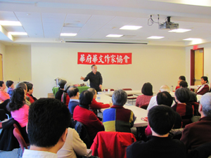 1月5日下午,冬日驕陽高照,乾冷低溫,卻沒有影響文友們關心文學的熱情。「華府作協」的「莫言與大陸文學」講座擠進了近五十位文友。近年足跡遍佈港台中美的張郎郎,在這場迴響熱烈的講座上,以「莫言現象」為註腳,為大家剖析了大陸文學「網絡書寫」的趨勢;嚴肅的主題,透過他詼諧的譬喻,變得淺顯易懂,也不斷引來台上台下會心一笑的和樂畫面。
