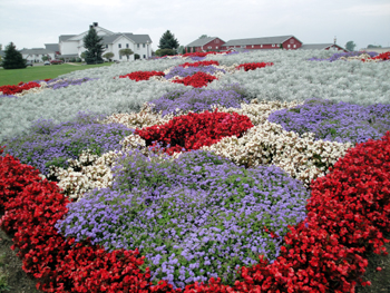 數街之隔有另一拼布花園「和平愛米許 」,面積不及前述的「條狀」拼布花園,但以紅白黃藍紫黑多種 色彩和複雜的幾何圖案取勝。中心白色長春花塊上用黑色蒼龍彩衣草拼出愛米許馬車形狀,並飾以真正的愛米許馬車輪胎,不僅別出心裁且具有立體效果。