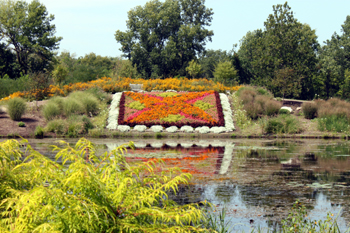 由接待中心南行,首站是佔地36英畝的Wellfield Botanic Gardens。放眼望去是一大片蓮花池,四周有小橋流水及雕塑藝品散佈其間,環池有漂亮整潔的石磚道引至24個花團錦簇的迷你花園,豔冠群芳的是以印州藝術家Diana Bennett的拼布藝品「希望之星 」為藍本的拼布花園。金盞花、秋海棠、金線蓮、香雪球及長春花等拼成大小重疊的四角星形圖案,在陽光池水的映照下一派金碧輝煌,期能帶給乳癌患者無窮的希望。