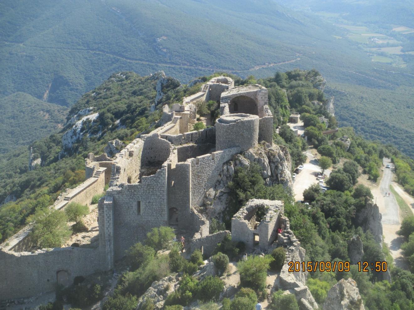 Chateau de Peyrepertuse 與鄰近多個碉堡位於法國與西班牙 邊境山區, 十三世紀時居住的 Cathars 因信仰不同,受羅馬 教廷討伐,另一個Cathar 據點 Chateau de Montseyur 被萬名 十字軍圍堡,在抗拒九個月後不守, 兩百餘戰士遭集體活焚. |
