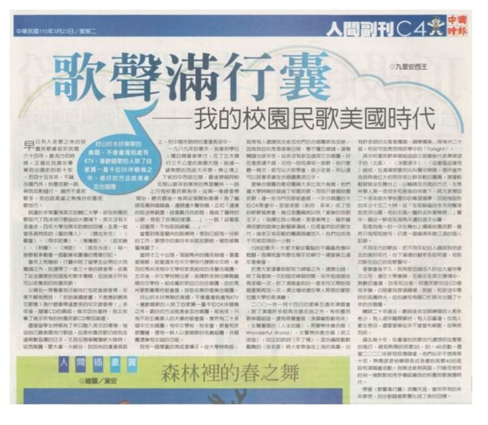 早已列入老歌之林的校園民歌緣起於民國六十四年,最流行的時候,正值從我高中畢業到出國留學前的那十年。而四十五年來,不論在國內外,校園民歌一路與我如影隨行。 雖然不是民歌手,我自認是當之無愧的校園民歌世代。 就讀於非常重視英文的輔仁大學,卻在校園民歌取代了西洋流行歌曲的大環境下,英文沒有太多進步,四年大學加兩年助教的回憶,全是一首首各具特色的〈龍的傳人〉、〈歸去來兮〉、〈廟會〉、〈雨中即景〉、〈橄欖樹〉、〈捉泥鰍〉、〈秋蟬〉、〈神話〉⋯〈就在今夜〉,每一首歌都承載著一個歡樂或憂傷的青春印記。 當年上飛機前,行囊中除了留學生必帶的大同電鍋之外,我還帶了一盒三十卷的錄音帶,收集了從金韻獎到民謠風和歌手專輯,包括幾乎所有可以收集到的校園民歌。 父親在一旁看著我仔細地打包那盒錄音帶,非常不解地問我:「你到美國唸書,不是應該聽英文歌嗎?為什麼要帶這麼多的中文錄音帶?」多年後,隨著CD的興起,每次回台灣時,我又收集了幾乎所有的校園民歌CD帶回美國。 儘管留學生時期為了早日融入英文的環境,強迫自己聽美國流行歌曲,但是校園民歌仍陪我走過無數孤獨的日子,尤其在開車闖蕩新大陸時,從西雅圖、蒙大拿、大峽谷、到加州⋯的漫漫長路上,和中國年節時的漫漫長夜中。 一九八九年的春天,我拿到學位,離開窩居三年半的洛磯山城,獨自開著車東行,花了五天橫行三千公里的美國大陸,經過一望無際的西部大平原,無止境上下坡的中西部丘陵,最後穿越阿帕拉契山脈來到東岸的馬里蘭州。 一路上只有校園民歌為伴,從第一卷錄音帶開始,聽完最後一卷再從頭開始循環。為了驅趕孤獨與嗑睡蟲,邊開邊大聲地唱,正如「遙遠的路途無窮盡,披星戴月向前程,唱起了舊時的山歌,想起了故鄉的家園⋯」,一路「迎著風,迎著雨,不怕那路崎嶇⋯」。 當看到馬里蘭州的路標時,想到已經有一份新的工作,夢想中的美好未來就在眼前,鄉愁被興奮掩蓋了。 當時才三十出頭,落腳馬州的隔年結婚。妻喜愛唱歌,趁著週末在中文學校代課教中文時,參加馬州洛城中文學校家長組成的洛聲合唱團。五年後,中文學校鬧分家,指揮許老師也順勢離開中文學校,組成屬於她自己的合唱團,由於馬州蒙郡屬華府都會區,故取名華府愛樂合唱團。 好山好水好無聊的美國,不像臺灣到處有KTV,喜歡唱歌的人除了自家買一臺卡拉OK伴唱機之外,最好的方法就是參加合唱團。那些年,聽說只有不到五萬華人的大華府都會區,竟然有二十多個中文合唱團,有中文學校、校友會、教會和宗教團體、還有一群人以愛唱歌的名義組團,合唱團還兼有交誼的功能。 我有一個厚重的男低音嗓子。從大學時期起,就常有人邀請我去參加他們的合唱團被我拒絕,因為我自知是個音樂白痴,看不懂五線譜,連看簡譜也很辛苦,從來沒有參加過其它合唱團。好在音感還不錯,任何一段弦律或一首歌,我只要聽一兩次,就可以大致學會,很少走音,所以還可以陪著老婆在合唱團裏混日子。 愛樂合唱團的最初團員大多比我大幾歲,他們讀大學時剛好錯過了校園民歌。而我只會唱校園民歌,連一些冷門民歌都會唱。一次合唱團的卡拉OK聚會中,那首老歌〈給你•呆呆〉成了我的新歌發表會,幾位老團員就叫我「愛樂的民歌王子」。比我小兩歲的指揮許老師是音樂博士,雖然覺得民歌的旋律比較簡單清純,仍是當然的民歌世代,後來又有年輕的團員陸續加入,我們也成為不可被忽視的一小群。 Y2K的春天,大家才剛從電腦的千禧蟲危機中甦醒,指揮就宣布要在隔年初舉行一場愛樂五週年音樂會。 於是大家連暑假都努力練唱之外,還要出錢,除了每星期一次的固定練唱時間,另外租借唱地再多唱一次,到了演唱會前的一個多月又開始每個星期再加一次,演出場地選在華人聚居的蒙郡社區大學的表演廳。 二〇〇一年一月十四日的愛樂五週年演唱會,除了演唱許多精典合唱名曲之外,有校園民歌串唱組曲,還有男聲重唱〈漁陽鼙鼓動地來〉,女聲重唱的〈人生如蜜〉,男聲無伴奏合唱〈Wonderful World〉,女聲無伴奏合唱〈泯江夜曲〉,如泣如訴的〈不了情〉,混合編隊載歌載舞的〈夜來香〉將大家帶進夜上海的氛圍,也有許老師的女高音獨唱,鋼琴獨奏⋯等等共二十首,和安可曲是西城故事中的〈Tonight〉。 其中校園民歌串唱組曲由三首最能代表異鄉遊子的〈北風〉、〈浮雲遊子〉、〈迎著風迎著雨〉組成,在滿場鼓掌和尖叫聲中開唱。理所當然由我與幾位大約同年或比較年輕的團員,穿著輕鬆服裝坐在舞台上,以輪唱及合唱的方式,在馬州華人第一吉他手和長笛的伴奏下,將大家帶回二十多年前大學校園中的青澀場景,回到強說愁的年少十五二十時。從「在那靜謐的冬天你飄落我荒涼心園,恰似北風一襲吹去秋意無限⋯」聲中,唱出一群走在海角天邊的遊子心聲。 那是我唯一的一次在舞台上獨唱校園民歌,雖然只有短短幾句,仍是一個值得笑傲江湖的個人記錄。 不同年代的歌曲,把不同年紀的人唱回到他逝去的美好年代,台下滿場的觀眾各取所愛,我仍沉醉在自己的民歌聲中。 音樂會後不久,我再度回鍋加入矽谷大厰甲骨文公司,還在大學和補習班兼課,在幾乎全英文環境中,無數的會議、加班和出差,校園民歌也從CD變成手機,仍陪著我度過機場、旅館、和旅途中零碎的孤獨時光,但也讓我有藉口忙碌淡