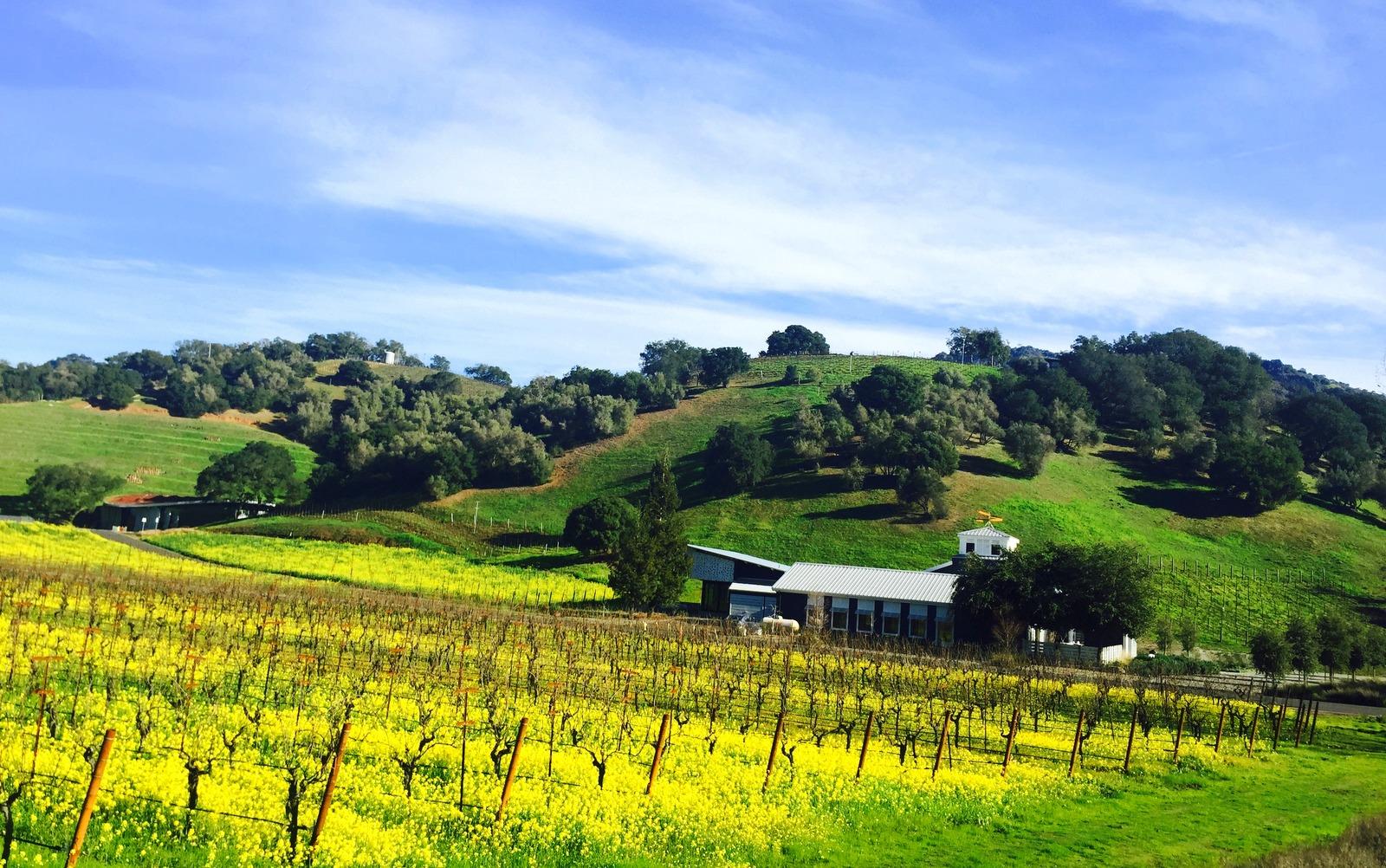 申未之交到Napa酒鄉住了三天兩夜,剛好遇到芥菜花開。循Silverado Trail 一路往北,參觀了幾個特別的酒莊。 我們先是被遍野的金黃吸引,停下車來。大片的芥菜花潑辣開在葡萄藤間,像極了印象派的油畫。這是不期而遇的Odette. 往Quixote(唐吉軻德)的路上,佳木夾道,田園景色醉人。它的建築極為特別,看不到一個直角,是奧地利建築師 Friedensreich Hundertwasser的傑作。色彩斑斕,有個小金塔,在陽光下閃閃發光。我們沒有預約便擅闖,但主人很客氣,容我們在院子裡拍照。 Chappellet 則蓋在一個隱密的山丘(Pritchard Hill),得從Hennessey Lake 旁邊一個不起眼的入口蜿蜒而上。酒莊佔地極廣,純粹家族企業。酒清純甘洌,非常好喝,卻不昂貴。 這兩個酒莊略無商業氣息,來到這裏好像到私人莊園作客一樣。 仿《西江月》一首,略誌此遊: 大野驚蟄起浪,清風徐送春芳。