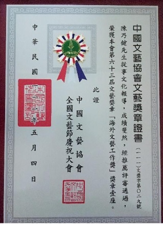 賀北美洛杉磯華文作家協會前理事陳乃健獲奬