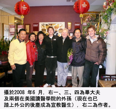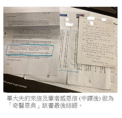 記得2008年見面的那天中午,我帶著他、他的二位在美學醫的外孫及他的台灣好友夫婦,做了半天南加州沿岸海上行。晚餐談笑中他對我說:「今晚無論你讓我吃了什麼,或你身上是否曾經流著我的血,當看到我過去的病人都是如此高興想看到我,就讓我覺得我的努力是很值得的,這也是一般人無法享受到的快樂」。由於我寫此文之前並不知道有「奇醫恩典」這本書存在,畢大夫更是隻字未提,真沒想到除了救我一命、院中諸多拐杖病童叫他畢爸爸外,他還有這麼多書中描述的善行義舉。我閱讀到書中最後一頁時總算看到了一封病人的感恩信被刊登出,病童的信寫著「人生猶如萬花筒,輕輕一搖動,整個變了樣。看那一萬二千個從您手中獲得新生的孩童,從此臉上綻放出花般的笑容。您就是那輕搖萬花筒的手,那神奇的觸動改變了他們一生的命運」,「重新締造成千上萬的年輕生命是您今生擁有的財富,舉世無一富豪能跟您攀比」~多麼熟悉的句子,這不是我多年來常講的幾句話嗎?意想不到作者Queseth 將我在2007 年寄給畢大夫的英文感恩信中取出片段做為此書的結語